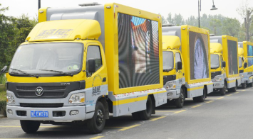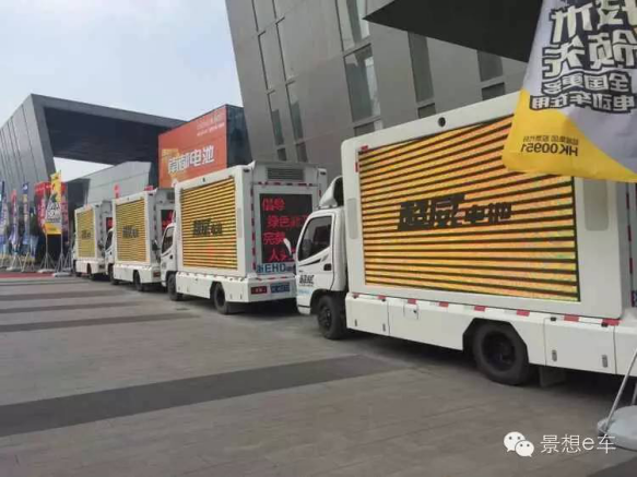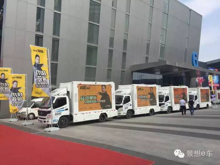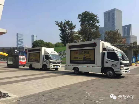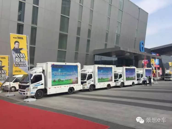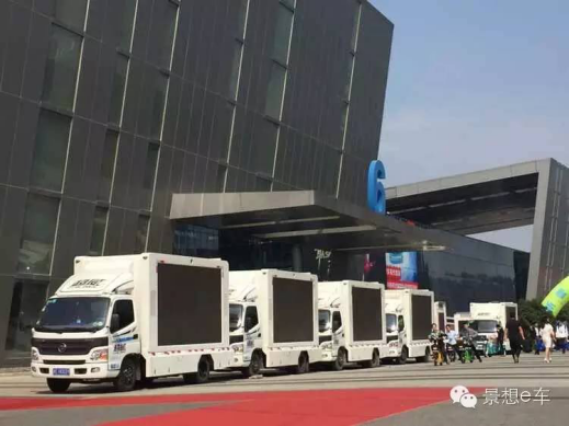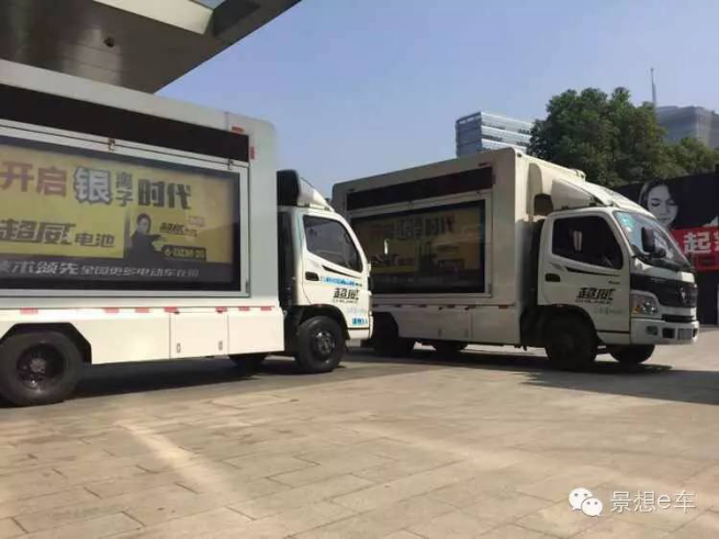 當(dāng)然這次展會吸引人眼球的絕不僅僅只是這些新能源自行車,展館的外面那一排壯觀的超威攜手我們上海景想共同打造的LED廣告車隊也很引人注目。一排壯觀耀眼的LED廣告車隊整整齊齊地排列在展會門口,上面播放的正是這次展會的信息以及贊助商超威電池的信息,清晰的屏幕和音響可以讓您清清楚楚的感受到這個展會的第一手資料。這次我們景想的宣傳車雖然車型不大,但這樣排列起來壯觀,宣傳效果更是加倍。
