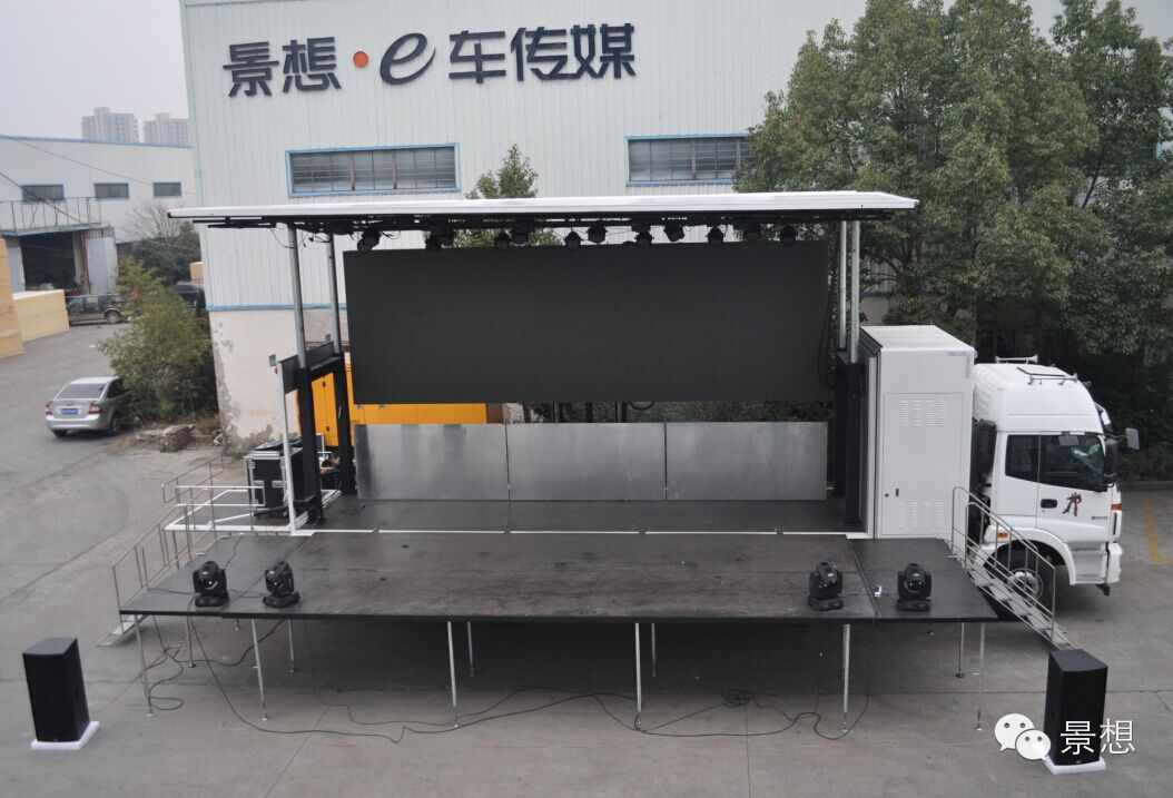 在眾多的流動(dòng)媒體中,流動(dòng)舞臺(tái)車已經(jīng)成為了不可或缺的一部分,它也為很多企業(yè)和單位承擔(dān)著宣傳的作用。這種車廂單面可全自動(dòng)展開形成舞臺(tái)臺(tái)面,車頂半翻,安裝LED全彩屏,LED屏可以升降,車廂另一面與車廂一起形成舞臺(tái)后臺(tái)的舞臺(tái)車正成為戶外舞臺(tái)演出活動(dòng)的新寵。