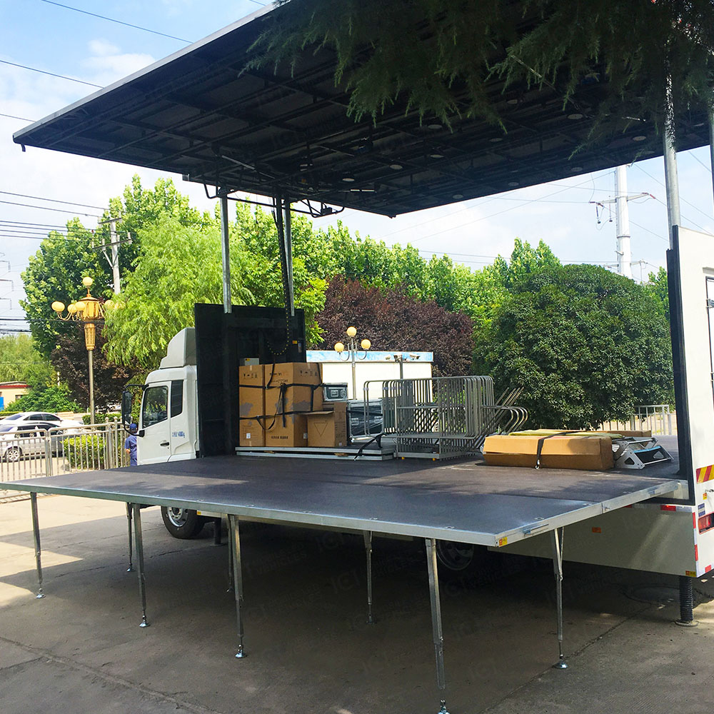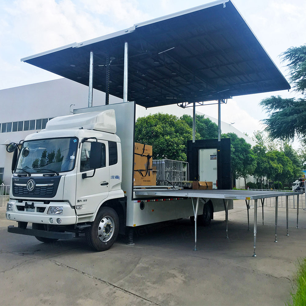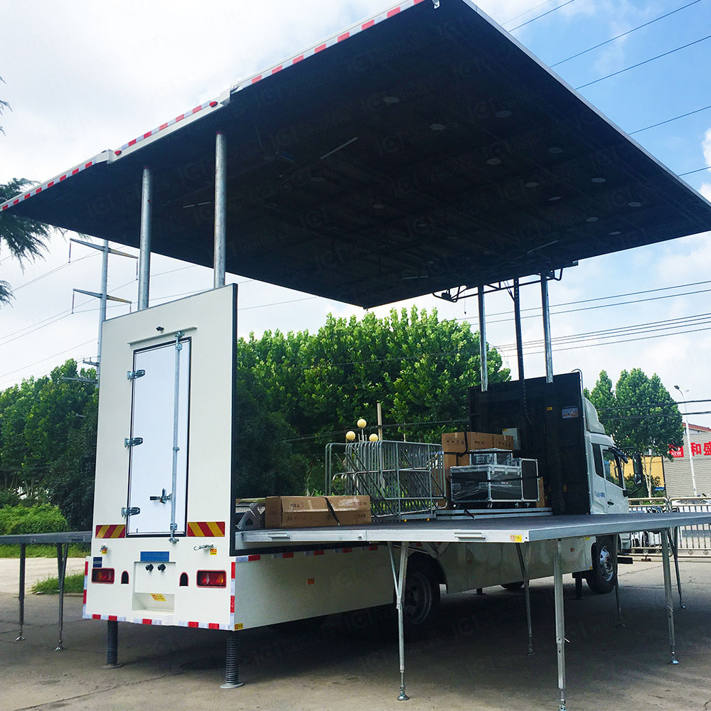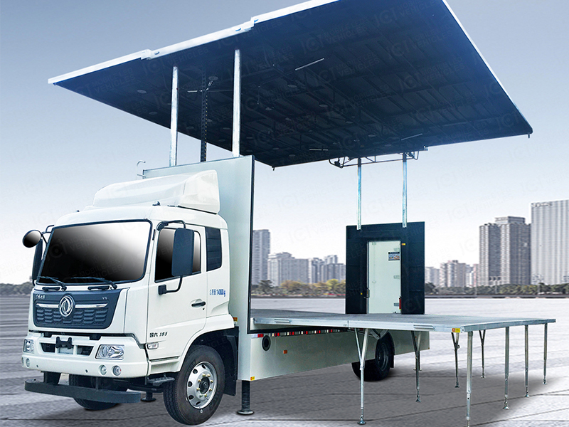 除了頂棚的靈活多變,舞臺車的左右兩側還巧妙地配備了折疊舞臺板。這些舞臺板通過二級液壓系統(tǒng)迅速且穩(wěn)定地打開,并與主車底板形成連續(xù)的平面,從而增加了舞臺的可用面積。這種創(chuàng)新設計使得舞臺車即使在有限的空間內(nèi)也能提供寬敞的表演空間,完全滿足各種不同類型和規(guī)模的表演需求。
